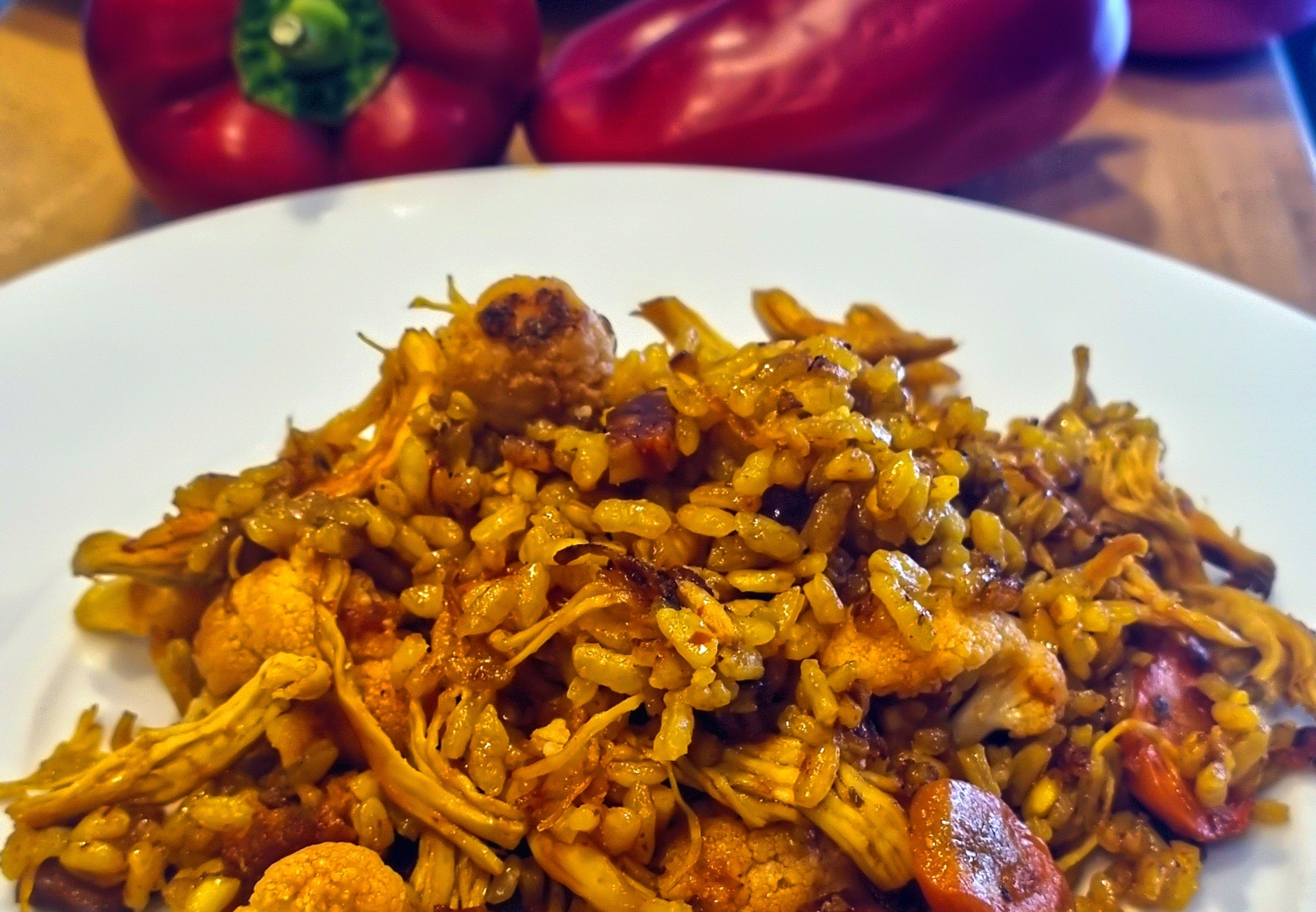 Blancs de poulet effilochés, chou-fleur, poivrons rouges, sobrasada (chorizo de Mallorca), dés de chorizo